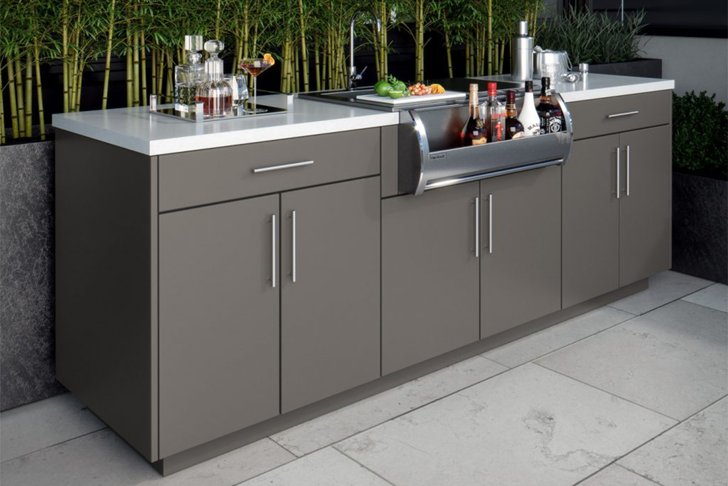 Units are available in a wide range of door and drawer configurations and can be fitted with accessories such as ice trays and trash can roll outs. Counter tops are available in an array of stone options or StarBoard material.